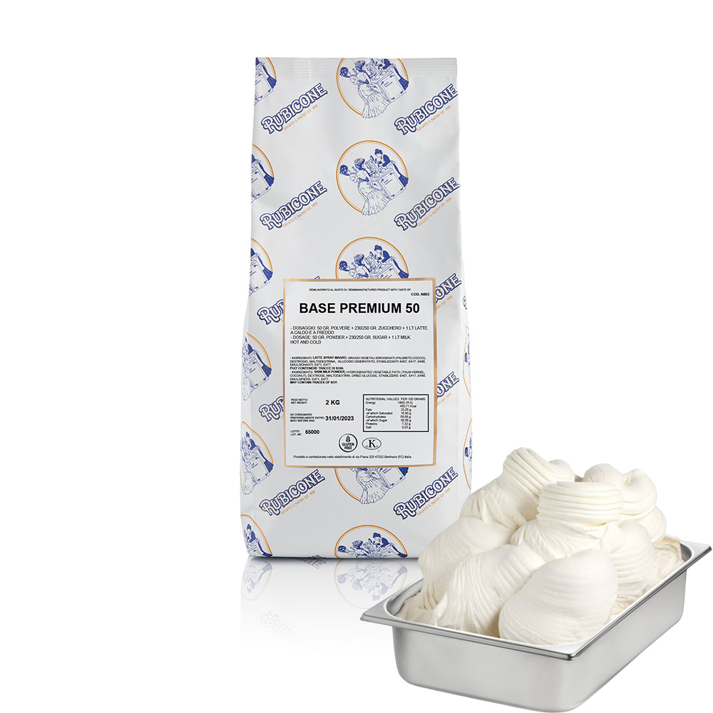 Bột làm kem tươi Rubicone BASE PREMIUM 50 dùng cho các máy làm kem hiệu Taylor, Taycool, Innova, Gelmatic, Smach, Frigomat, Finamac, Carpigiani. Với những máy làm kem chất lượng thì sản phẩm kem ra rất ngon, còn với những máy làm kem, sản xuất ở Trung Quốc giá rẻ sẽ chạy ra sản phẩm không ngon.